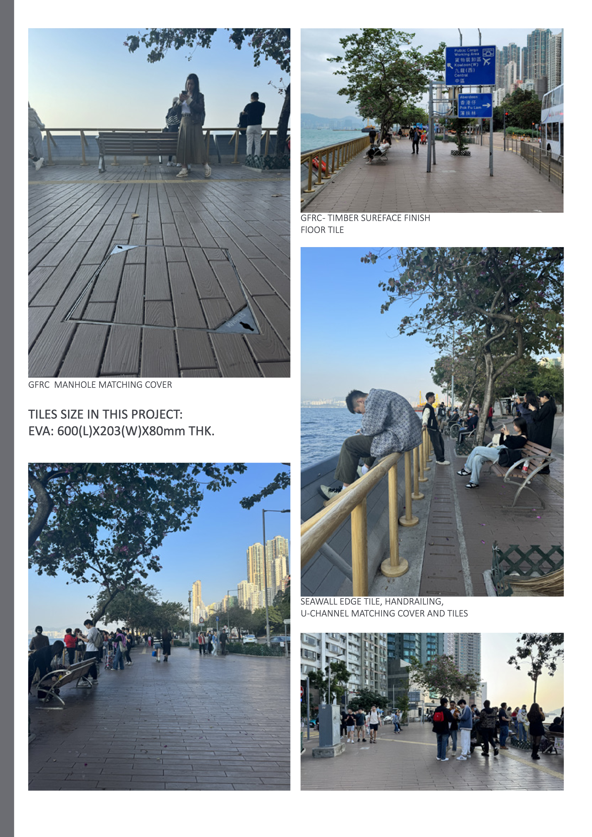 堅尼地城海濱長廊GFRC 倣木地磚, GFRC倣木柱 及圍欄, GFRC去水蓋.
