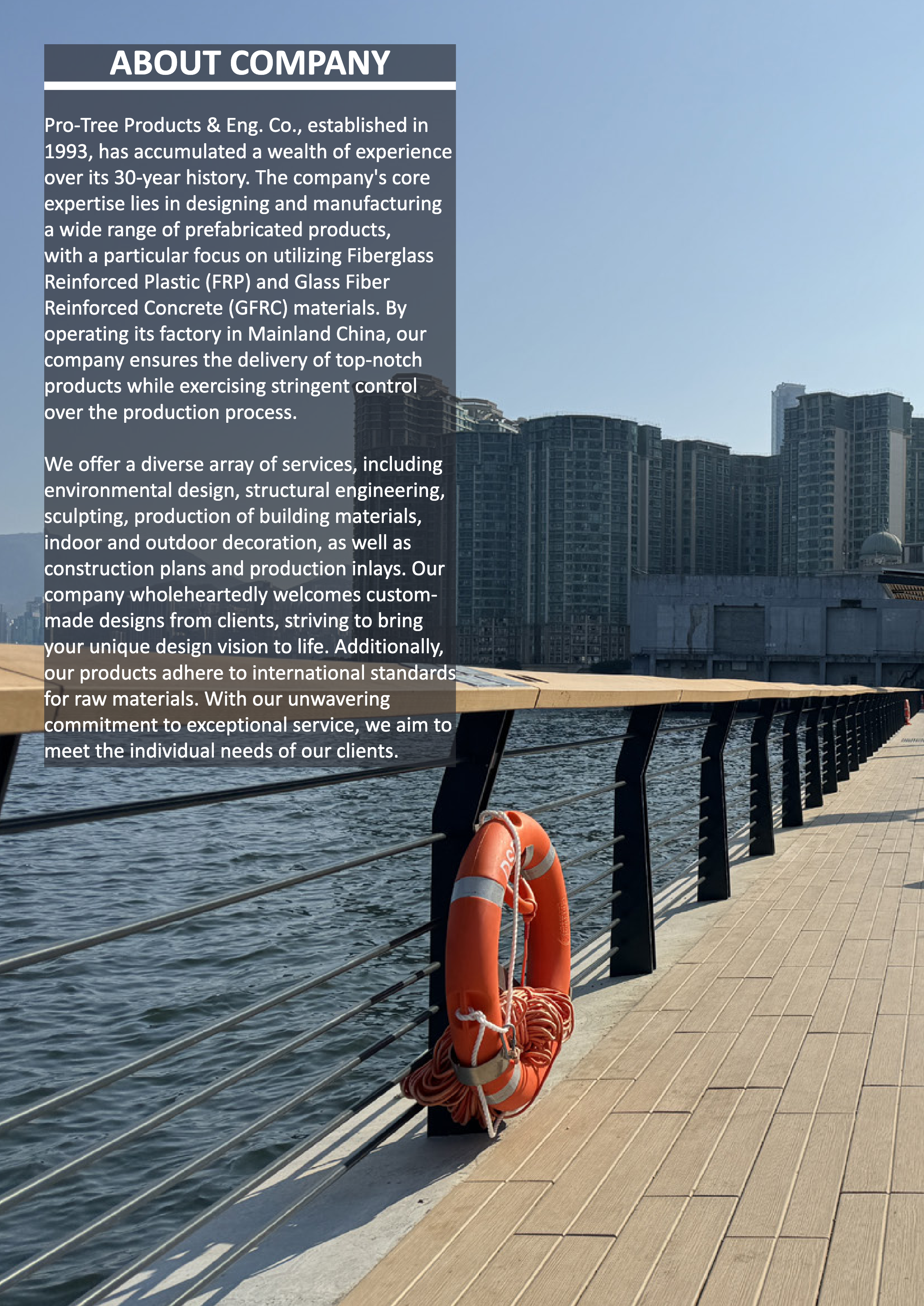 在其30年的歷史中積累了豐富的經驗。公司的核心專長在於設計和製造各種預製產品,特別註重利用玻璃纖維增強塑料(FRP)和玻璃纖維增強混凝土(GFRC)材料。公司在中國大陸設有工廠,確保提供一流的產品,同時嚴格控製生產過程。